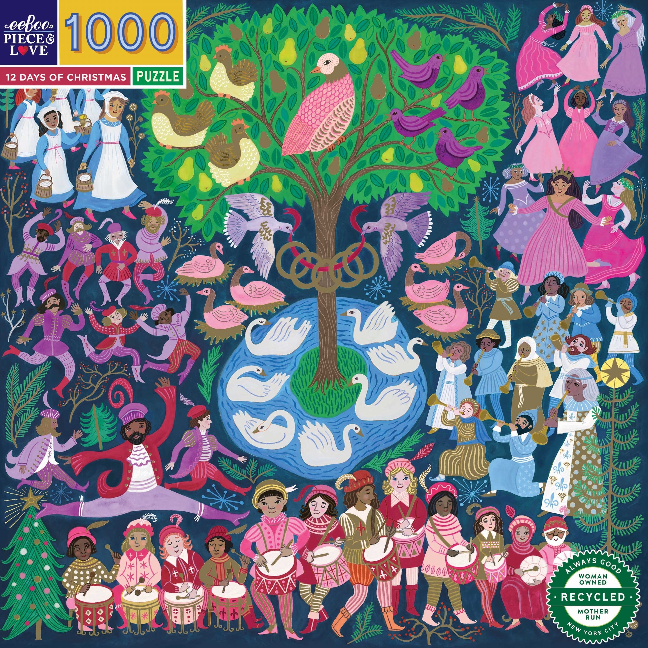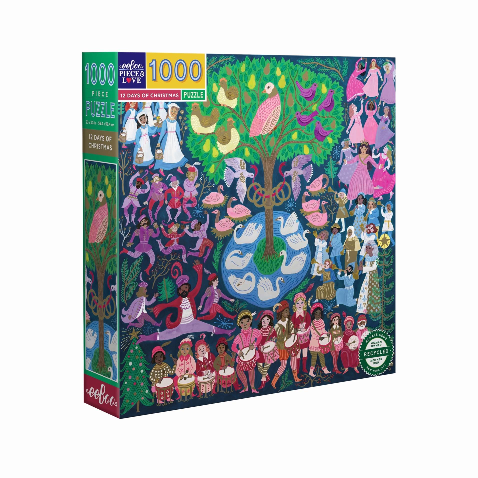 Eeboo-Puzzles bestehen zu 90% aus recyceltem Karton und werden mit pflanzlichen Druckfarben bedruckt, um die Umweltbelastung zu verringern. Quadratisches Puzzle in Gold-Metallic! 1000 Teile. Vorlage ist enthalten. 12 Tage Weihnachten ist ein 1000-teiliges Puzzle mit goldenem Schimmer. Eine visuelle Umsetzung aller traditionellen Weihnachtslieder. Fröhlich illustriert von Cynthia Cliff, ist dieses Puzzle eine tolle Aktivität für Familien zur Weihnachtszeit! Abmessungen der Schachtel: 25,3 x 25,3 cm Abmessungen des Puzzles: 58,5 cm Seitenlänge