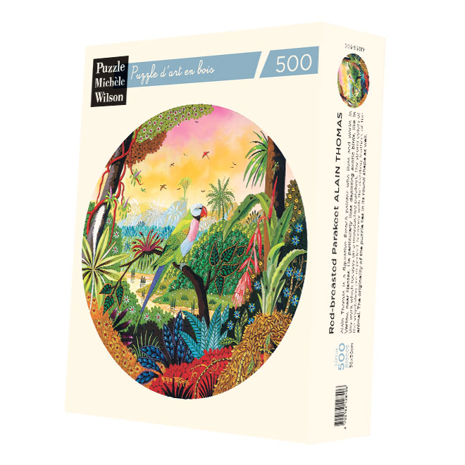 Kunstpuzzle aus Holz mit ca. 500 Teilen, das in Frankreich umweltfreundlich von Hand zugeschnitten wurde. Alain Thomas ist ein französischer figurativer Maler, der in Vertou in der Nähe von Nantes lebt und arbeitet. Er stellt besonders gerne exotische Vögel dar, wie in diesem Werk, das einen Schnurrbartsittich hervorhebt. Die kräftigen Farben der Vegetation harmonieren perfekt mit dem leuchtenden Gefieder des Tieres. Die Originalität dieses Puzzles liegt auch in seiner kreisförmigen Form! Maße: ca. 36 x 36 cm #Frühling